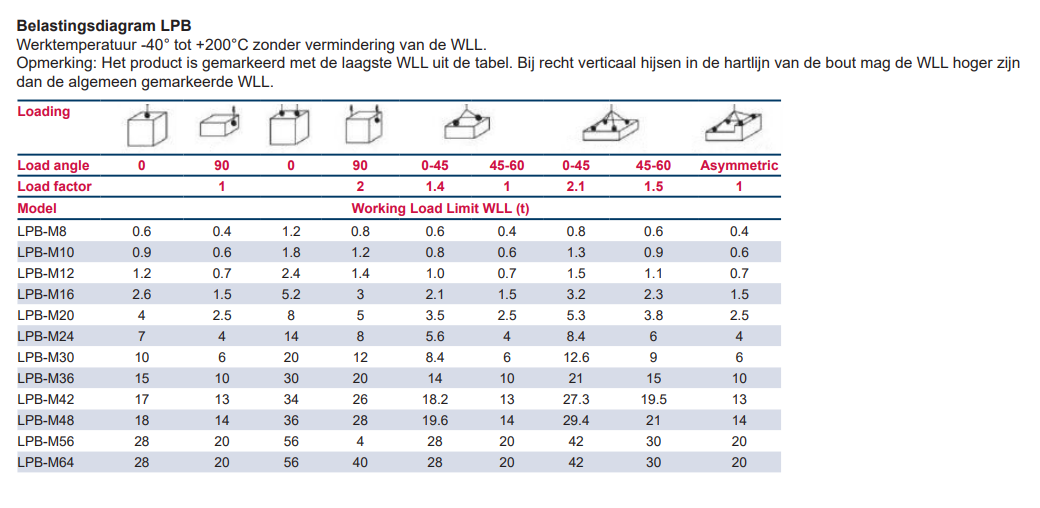 - WLL-indicatie: De LPB is gemarkeerd met de laagste WLL op 90° als de algemene WLL. De WLL-grafiek biedt een hogere WLL voor rechte verticale belasting. Zie ook het belastingsdiagram.