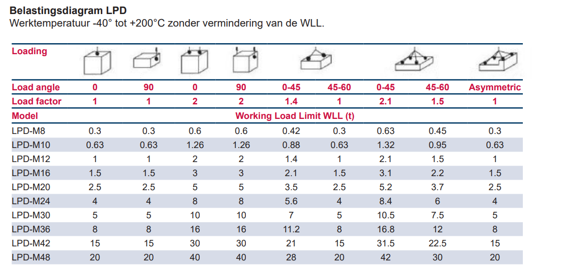 - Waarschuwing: Bekijk voor gebruik het WLL-diagram om de juiste LPD voor uw toepassing te selecteren