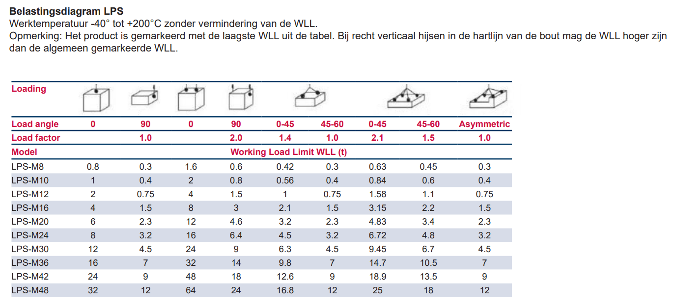 - WLL-indicatie: De LPB is gemarkeerd met de laagste WLL op 90° als de algemene WLL. De WLL-grafiek biedt een hogere WLL voor rechte verticale belasting. Zie ook het belastingsdiagram.
